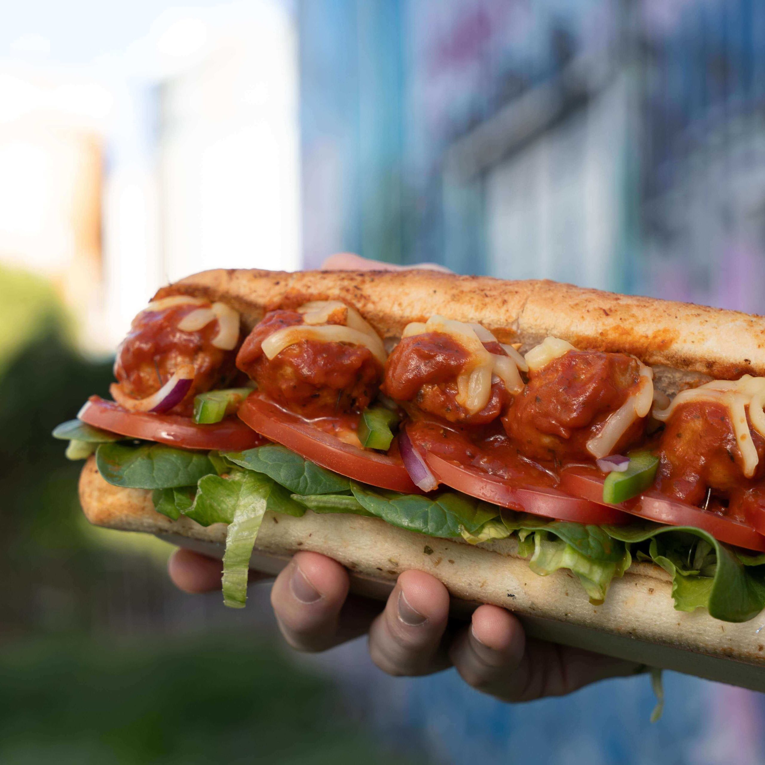 Meatballs in Marinara Sauce, Mozzarella Cheese, Spinach, Tomato, Onion, Olives, Garlic Aioli, Toasted on Italian Herbs & Cheese Bread.